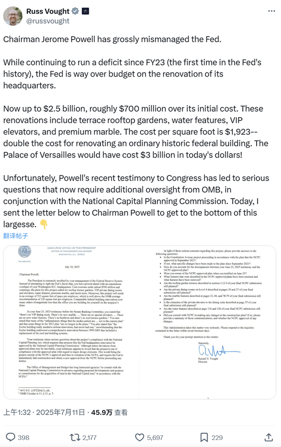 “虽然自23财年以来一直处于赤字状态(这是美联储历史上首次),但其总部大楼的翻修工程却远远超出了预算。”沃特在社交媒体网站X上写道。