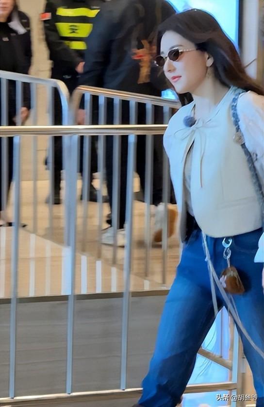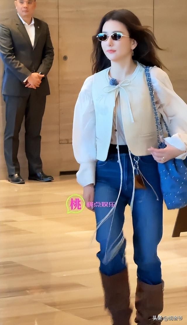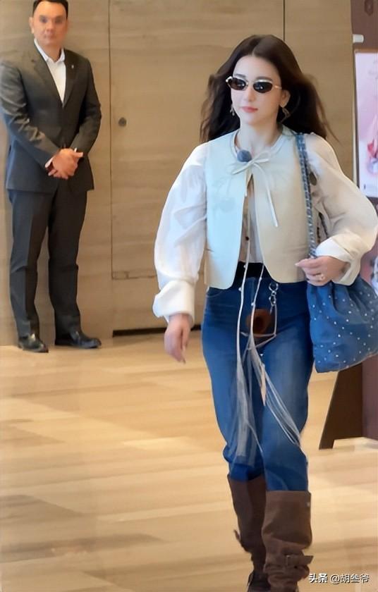 下半身搭深色牛仔裤和堆堆靴,身上背着香奈儿包包,戴的墨镜也是高奢品牌,看得出来一身穿搭都是精心打扮过的。